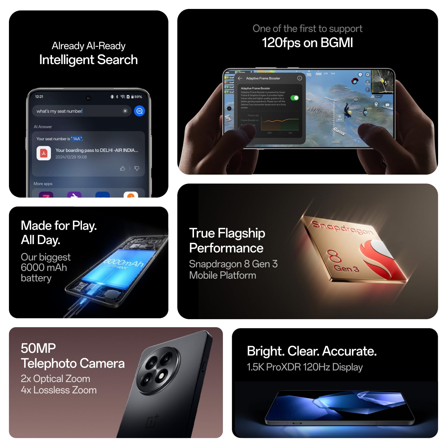 • Flagship power made smarter with the Snapdragon 8 Gen 3 flagship – Up to 98% faster AI, 30% faster CPU compared to the OnePlus 12R. The OnePlus 13R maximizes the CPU efficiency of the Snapdragon 8 Gen 3 when gaming, while lowering heat and power consumption.